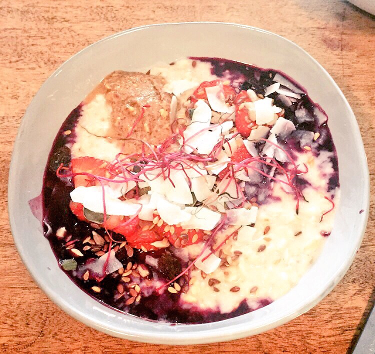 We opted for two gorgeous helpings of porridge – blueberry porridge, a comforting bowl of oats cooked in coconut milk, served with blueberry compote, strawberries, toasted rye granola, coconut, almond butter…