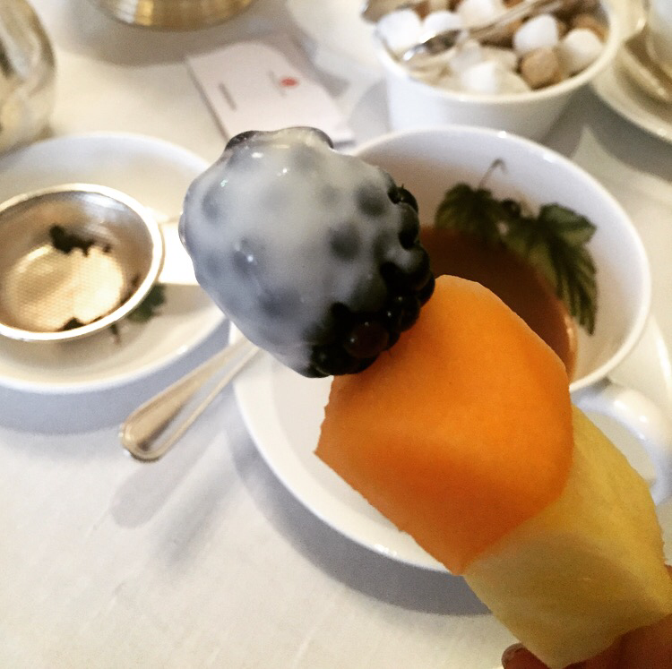 Next, a plate of a “fruit kebabs” substituting for scones – skewered fruits served with a honey-yogurt dip. We actually found ourselves quite enjoying these, but likely did so as we were safe in the knowledge that we did have the scones to look forward to.
