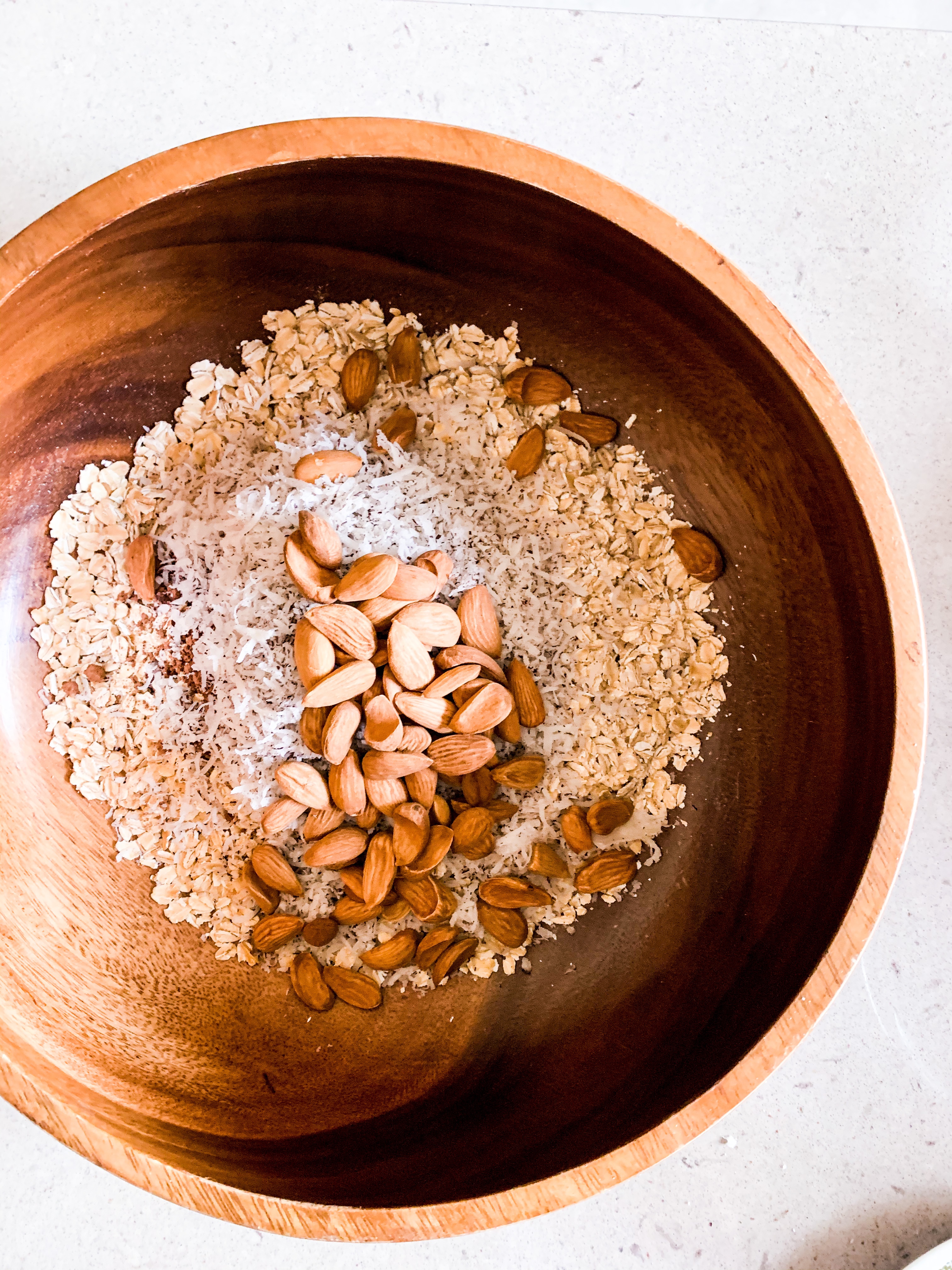 - Mix together the oats, almonds, cocoa powder, shredded coconut, sea salt and cinnamon in a large bowl.
