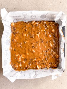 - Pre-heat your oven to 175°C ; and prepare an 8×8 inch baking pan, lining and greasing it with parchment paper.