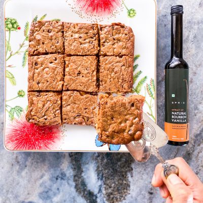 For the unfamiliar, think of blondies as blonde brownies. There’s not a fleck of cocoa powder in the batter; but what they lack in chocolatey-ness, they more than make up for with deep accents of vanilla. As high-quality vanilla is key, I always use the tried and tested Sprig’s Extract of Natural Bourbon Vanilla to impart the signature flavours of Madagascan Vanilla Beans.