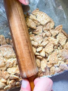 - Crush the biscuits – you want the broken biscuits to be of different shapes and sizes (not fine crumbs). I find it easiest to put the biscuits in a ziplog bag and crush them with a rolling pin.