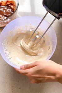 - Next, beat the egg and sugars with a hand mixer/ stand mixer on medium speed for 4 – 5 minutes. Mix in the vanilla extract half-way through, continuing to beat the mixture until it has a pale, creamy colour and light, creamy texture.
