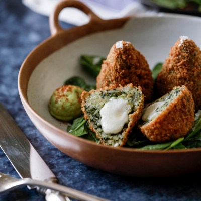 - Now deep fry the rice balls in vegetable oil at 160 degrees, until well golden. Season with a touch of salt, and serve hot with a garnish of baby spinach and crushed avocado.