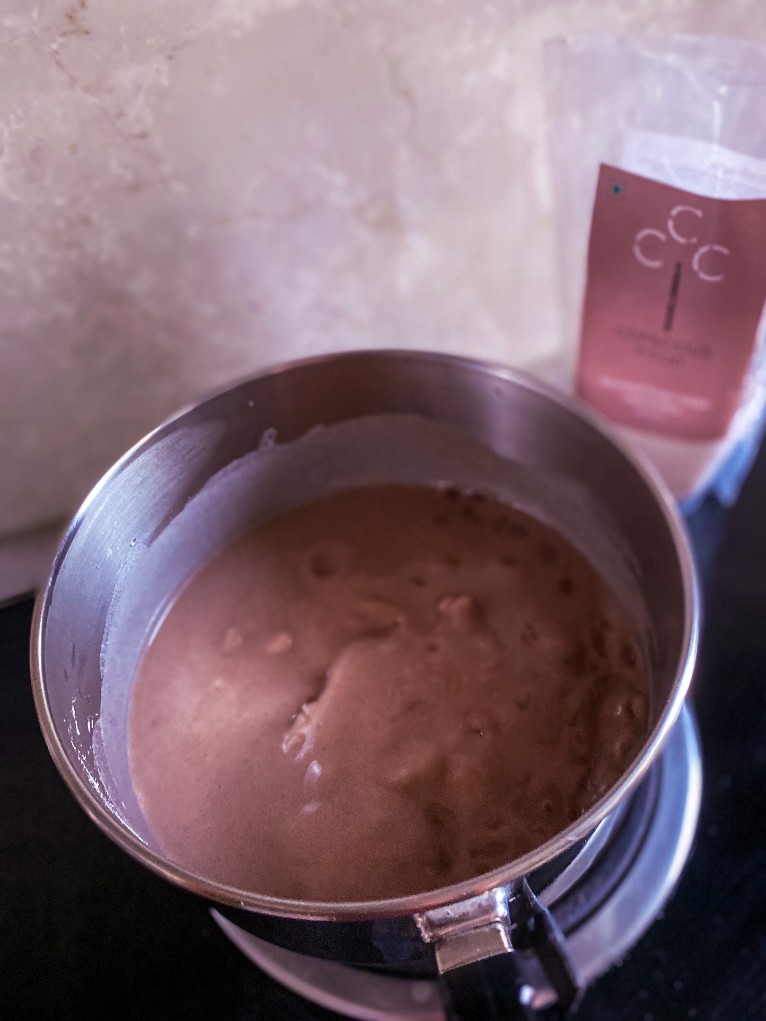 - Add the water and sprouted ragi powder to a saucepan. Cook on medium low heat, whisking well continuously to ensure that there are no lumps.