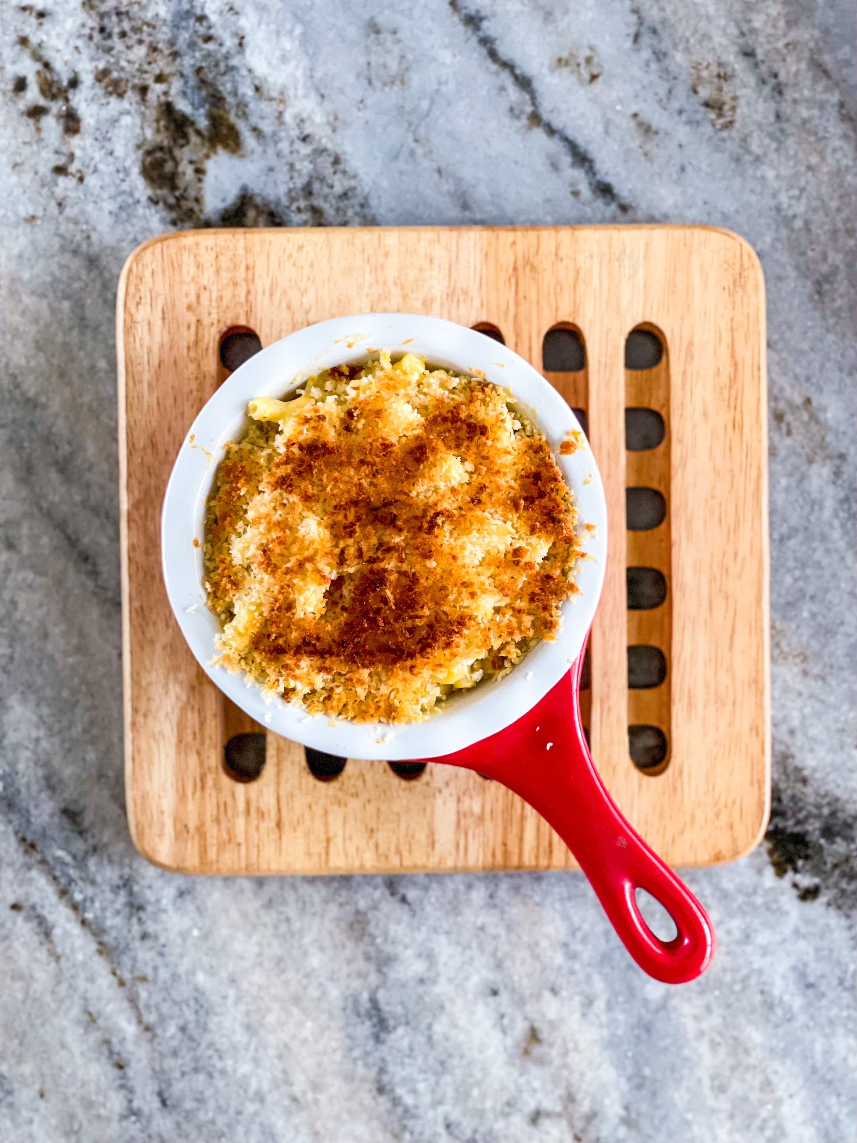 - As an optional step: pour the mac and cheese out into an oven-proof dish. Top with the panko bread crumb mixture and bake/ broil in a pre-heated oven until the top is golden brown and you can see the cheese bubbling.