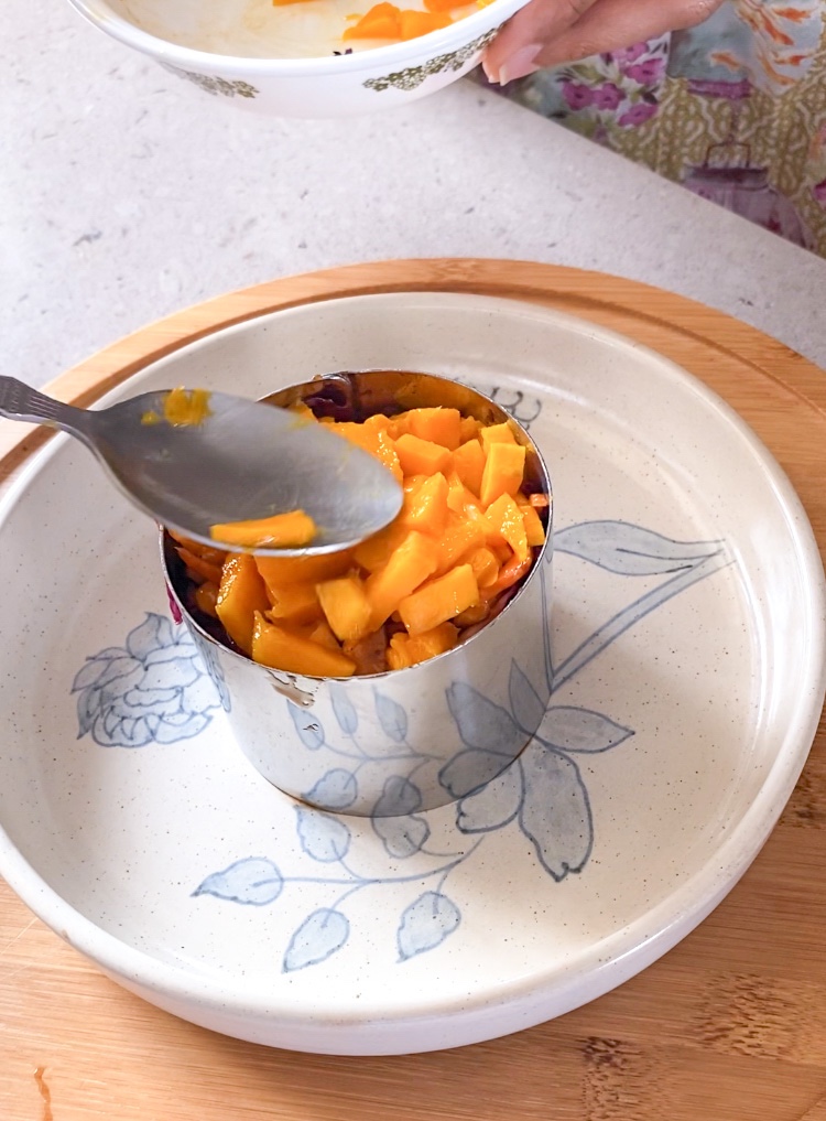 - Now place a medium-sized food ring on a serving plate. Pour the salad into the mould and gently press the mangos on top.