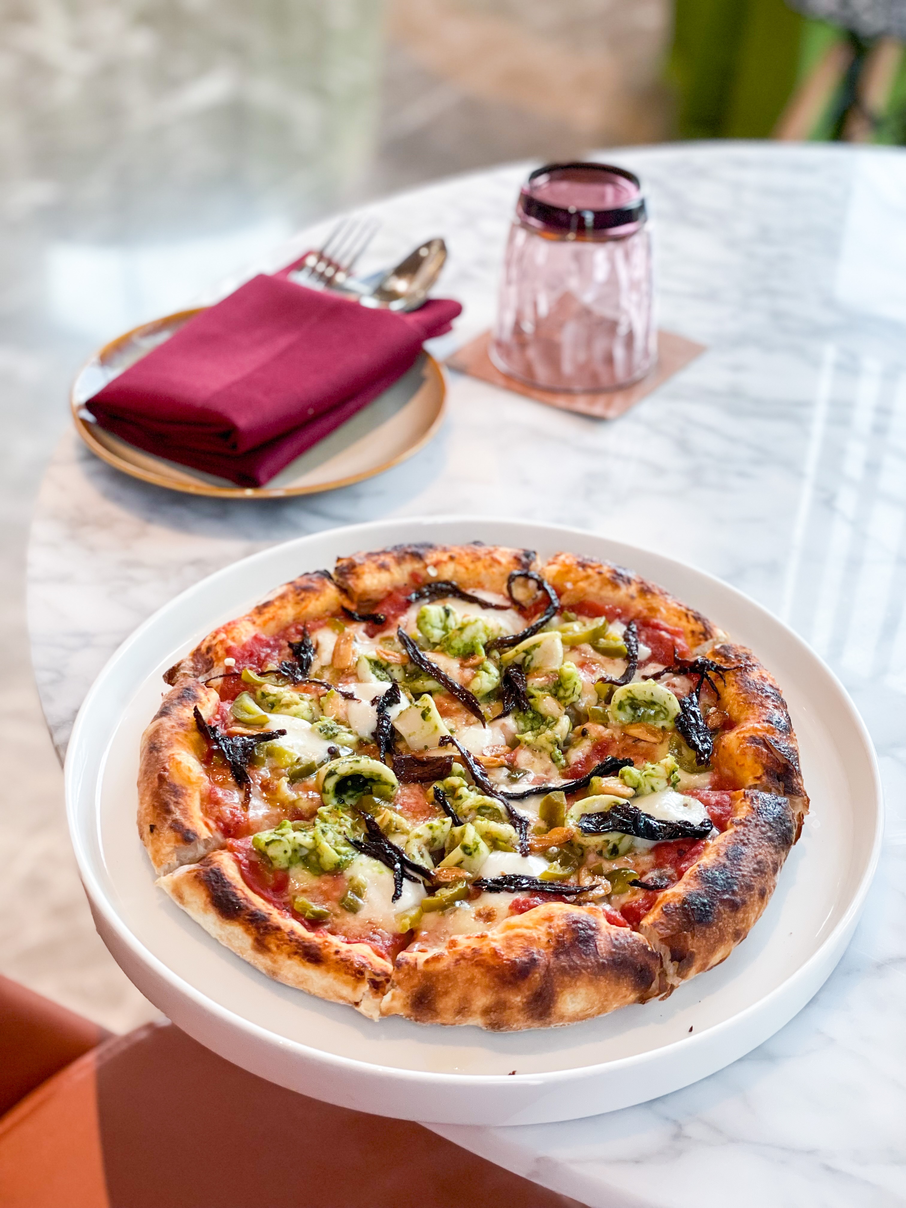 I bookmark the gargantuan bathtub for a leisurely soak later in the evening; but for now, we hasten down for lunch at The Smoked Vine – the all-day restaurant celebrating local and seasonal produce, alongside beautifully-blistered pizzas baked amidst dancing flames in an impressive Beech Oven. Thereโs a lot to feast on visually here too. The bright and vibrant setting is peppered with a colourful palette that is comfortably consonant with the clean lines and polished brass touches characteristic of a more modern design philosophy.