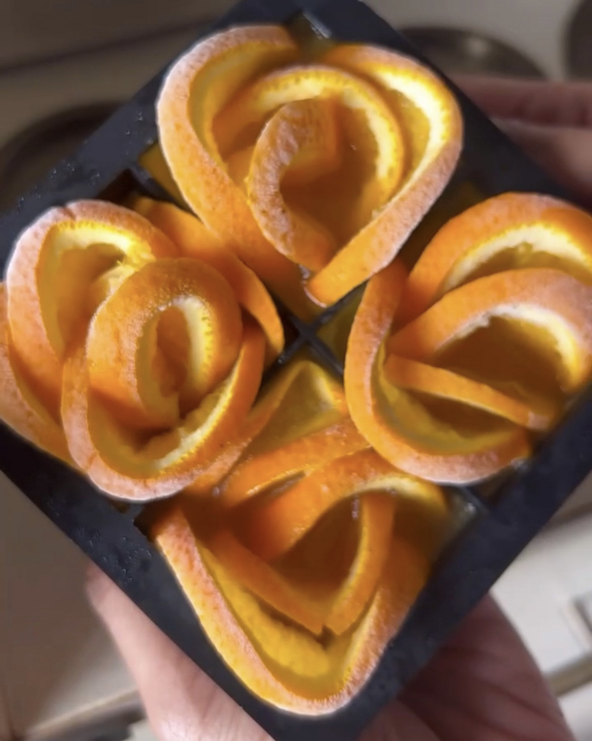 - Arrange the slices in a deep enough ice cube tray as shown in the video below, curling the slices inwards into a rose shape. Fold the halved orange slices and insert them in the centre of the rose.