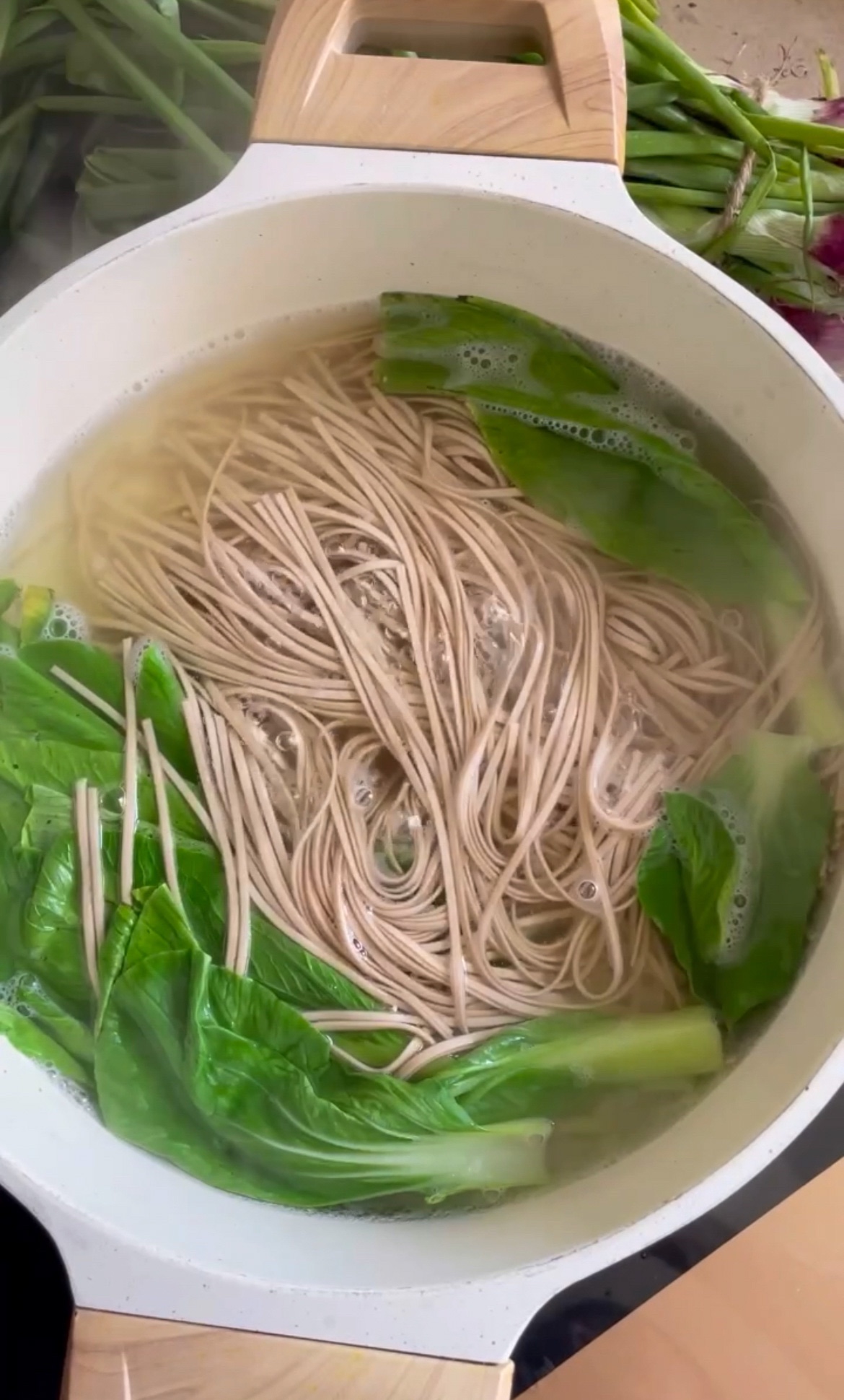 - Cook your noodles of choice. You can add the bok choy to the same pot while the noodles are cooking, removing the cooked bok choy immediately once blanched.