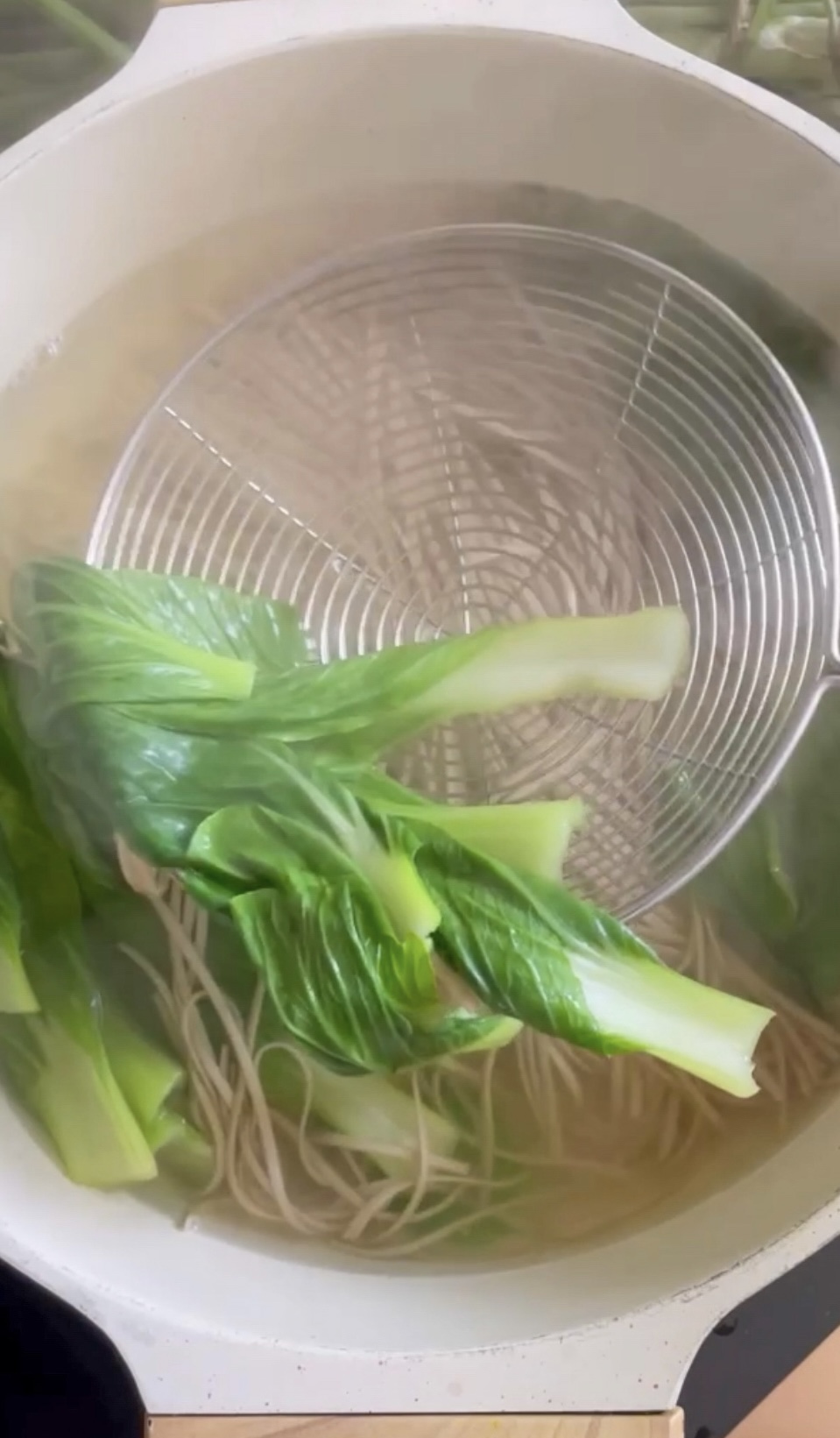 - Drop in the noodles and the cooked bok choy, along with other toppings of choice.