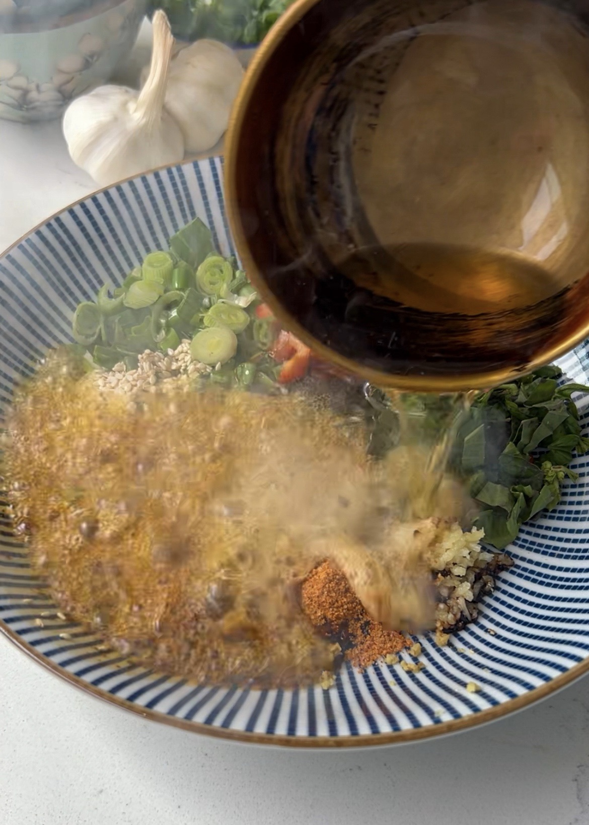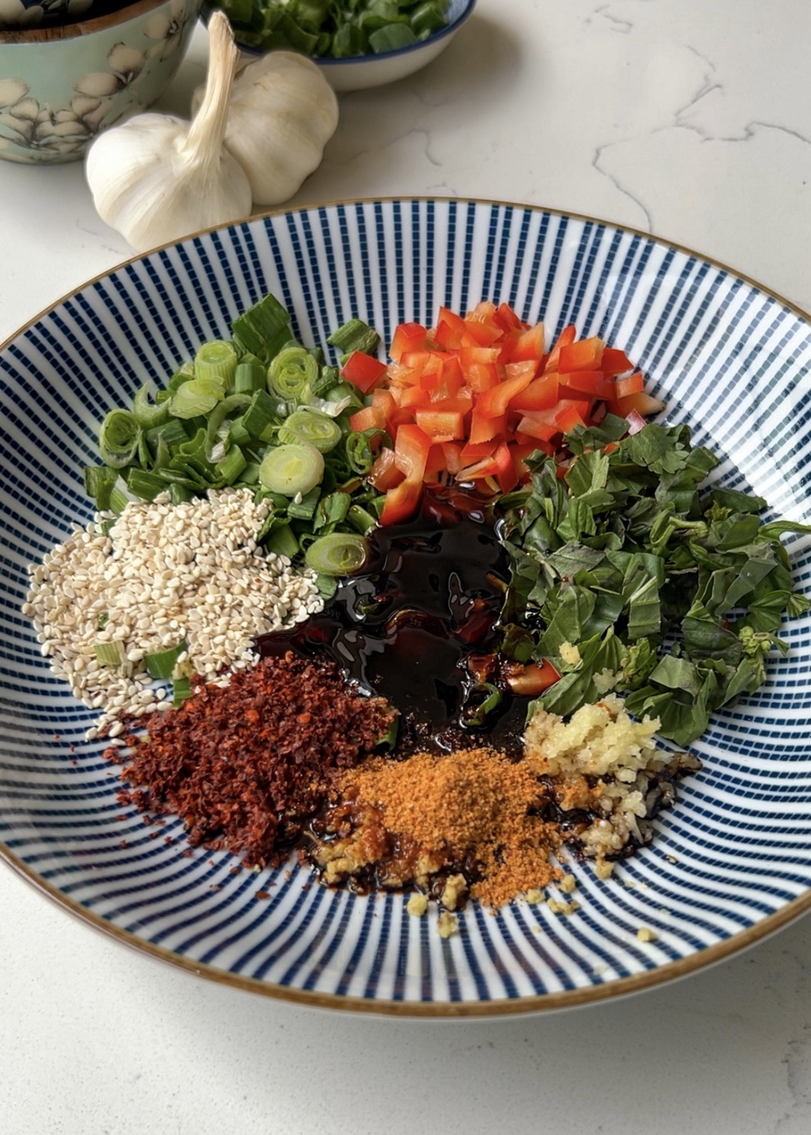 - To a large heat-proof bowl: add garlic, spring onions, basil, coriander, red peppers, sesame seeds, gochugaru, soy sauce, lime juice, oyster sauce