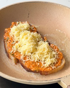 - Assemble: spread the spicy cheesy mix over a thick slice of bread (we love sourdough!). Layer with more grated cheese on top and cover with another slice of bread.