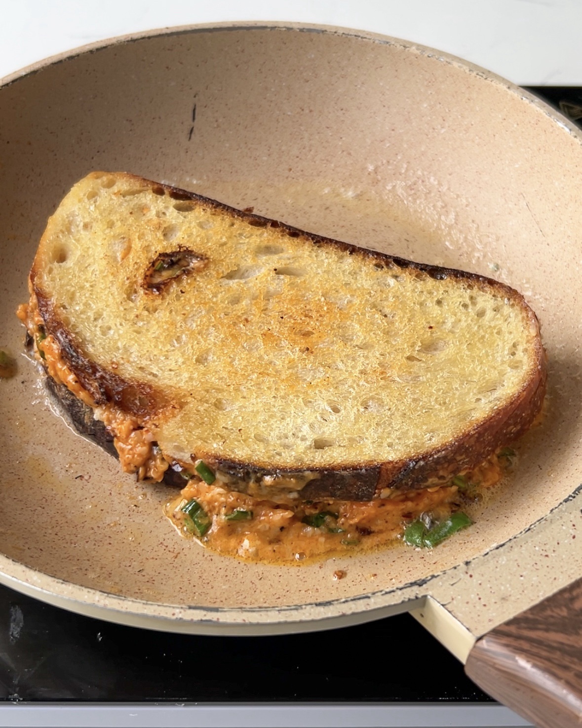 - Cook your spicy grilled cheese: melt a generous knob of butter and add your toastie to the pan, flipping halfway. Cook until both sides are crisp and golden on the outside but the cheese inside has melted to perfection. Serve hot and DIVE IN!