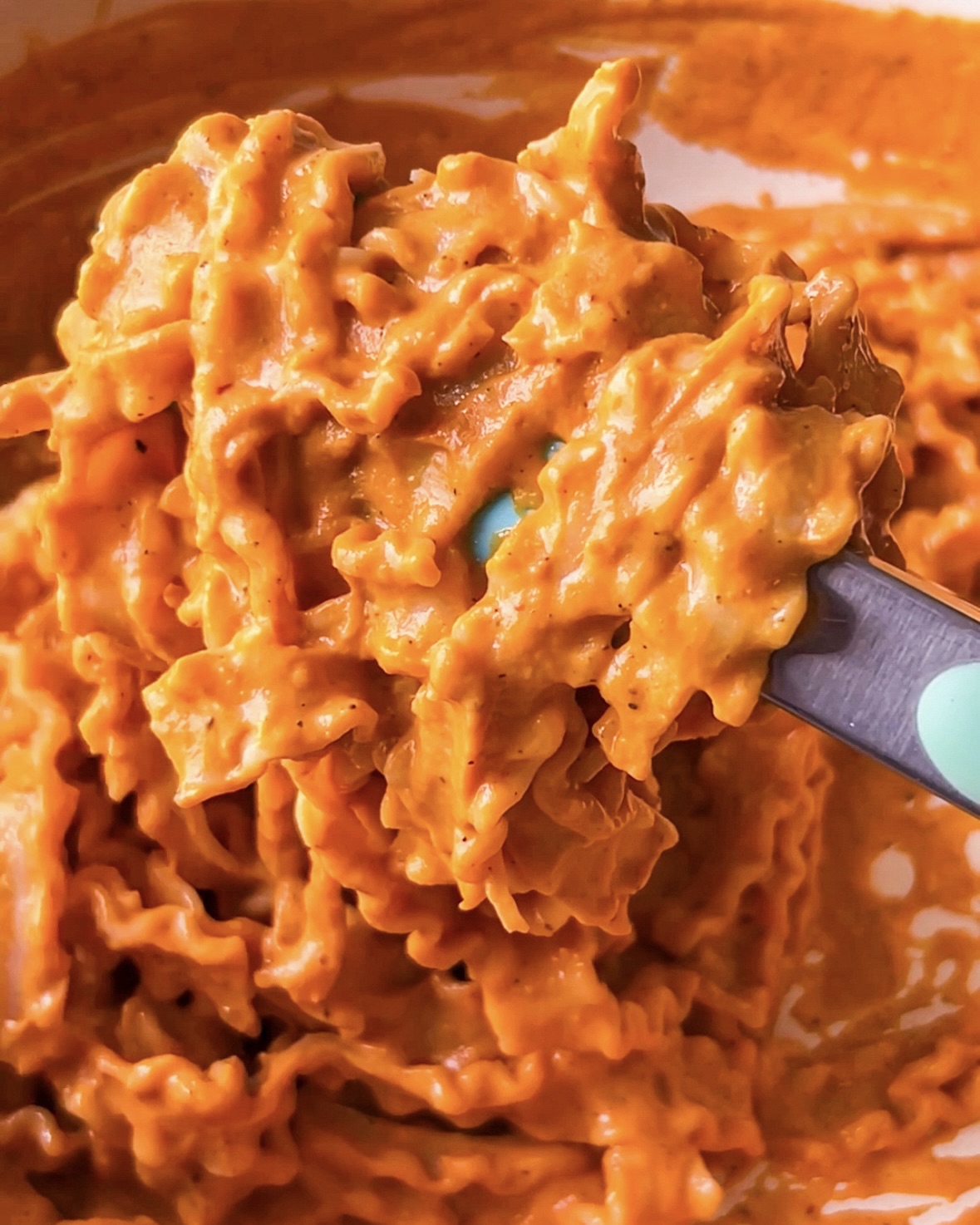 Add the roasted to a blender along with the roasted garlic cloves (squeezed out from the bulb), feta (or paneer/cottage cheese/ricotta), and a bit of tomato paste. Season with herbs and chili flakes for a little kick. Pour in some cream (or coconut cream) and a splash of the pasta water. Blend until you have a smooth and creamy sauce.