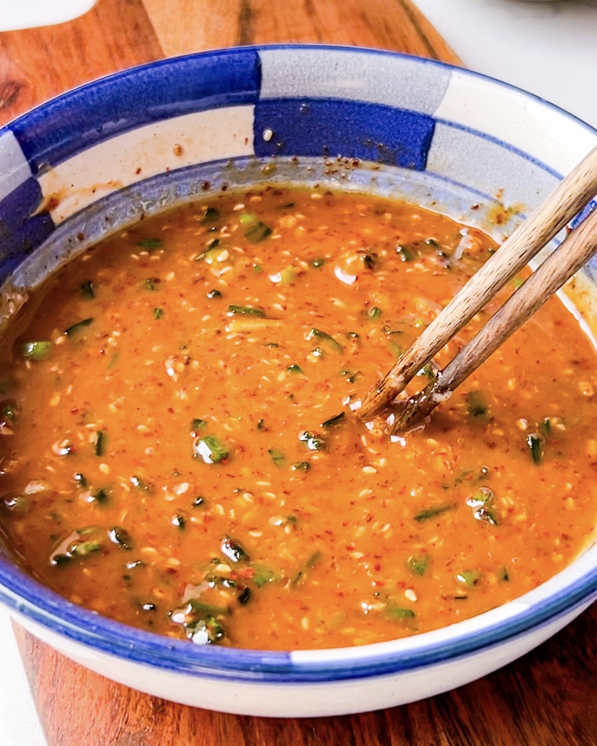 - Bring together the sauce: pour the hot oil over the chilli garlic base. Whisk well to combine, then stir in your remaining ingredients – rice vinegar/ lime juice, light soy sauce, tahini or sesame paste, peanut butter, sugar and brewed black tea (the latter is our secret ingredient which adds a nuanced depth of flavour to our sauce!)