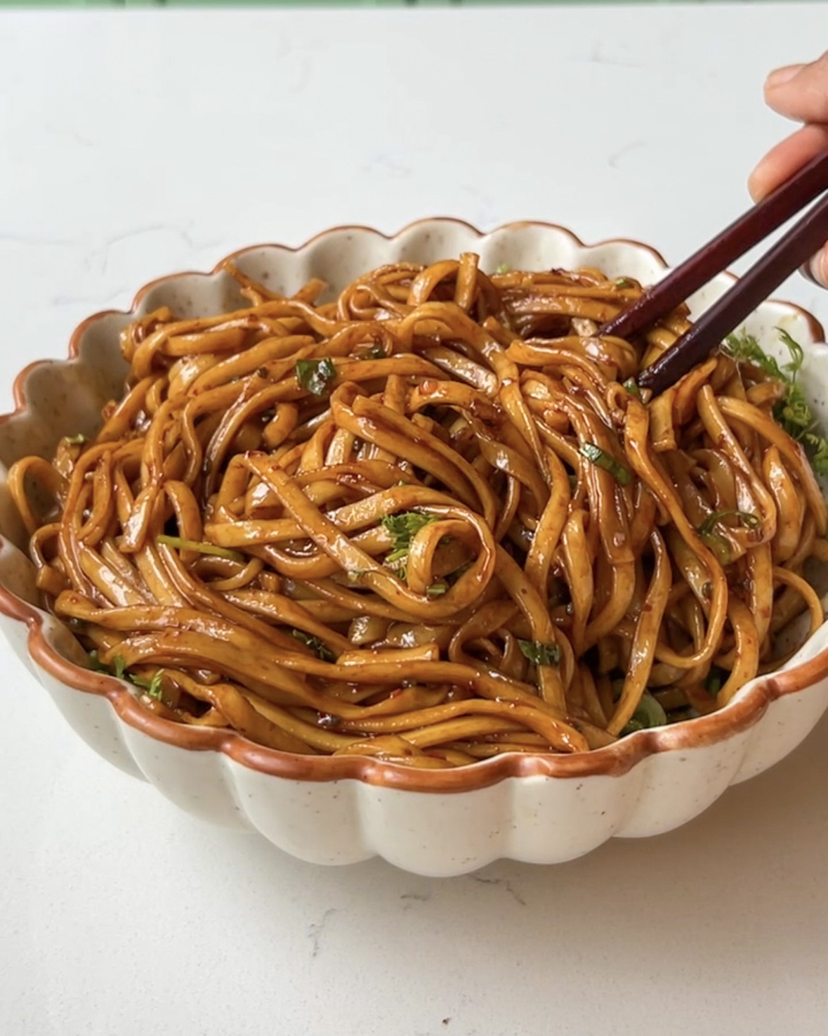 - Pour the hot infused oil over the noodles and mix well until fully combined.